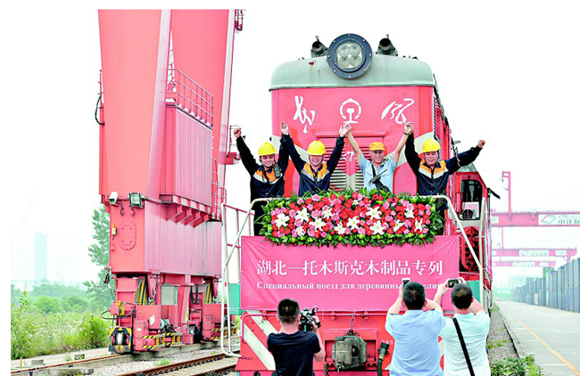 A freight train loaded with wood products bound for Wuhan from Russia's Tomsk arrived.
